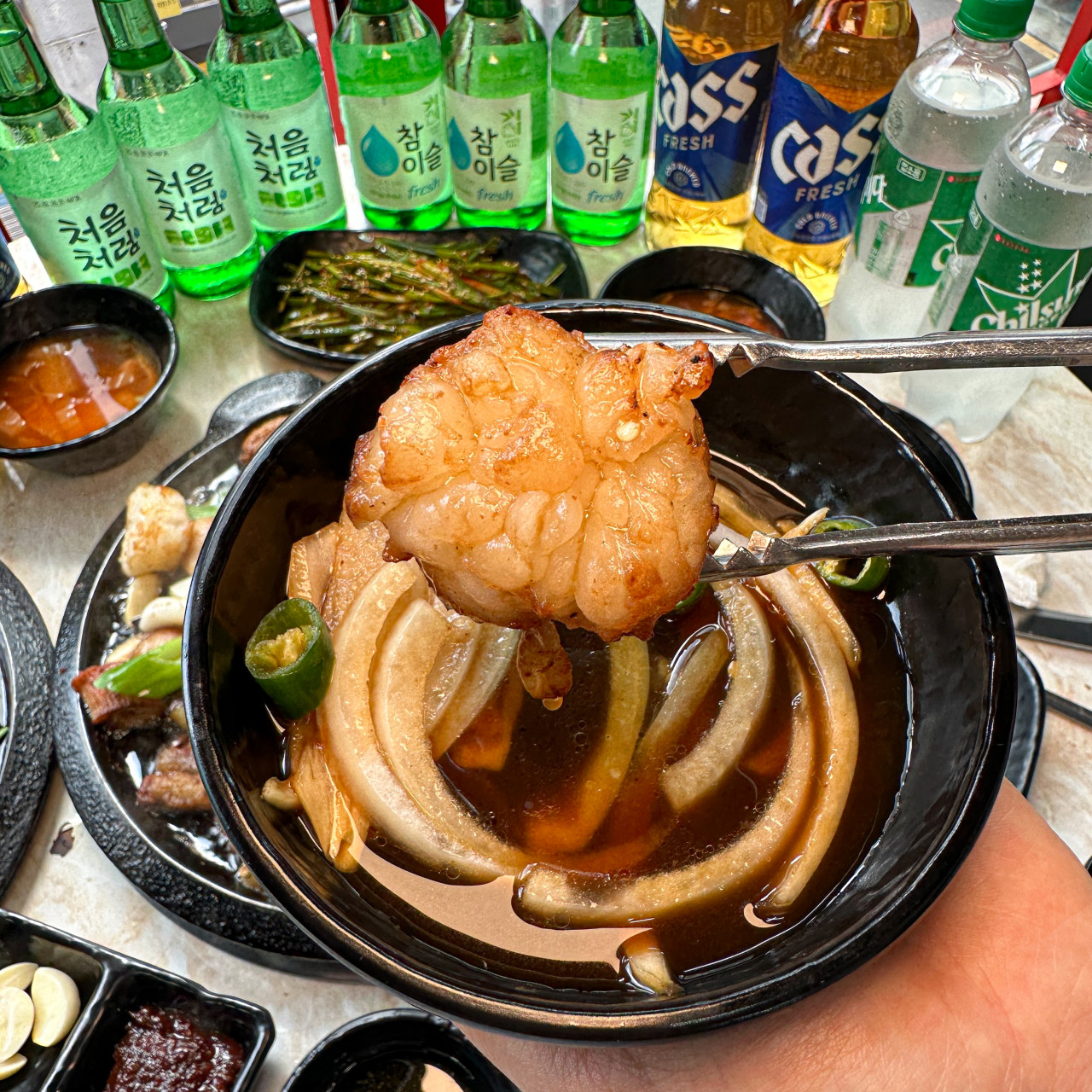 - 평소 곱창은 잘 안 먹는데, 여기 와서 생각이 바뀌었습니다... 곱이 꽉 차있어서 느끼하지 않고 고소하고 같이 나온 부추무침이랑 먹으니 술이 술술 들어갑니다;